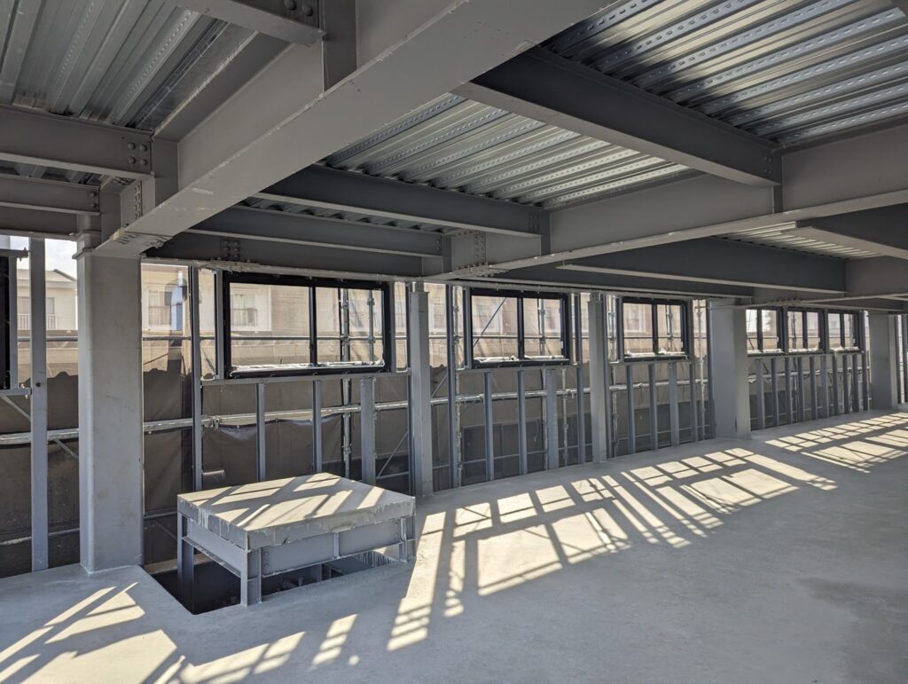 鉄骨建方を終え、外部サッシの取り付けと内装下地の施工が進む現場です。